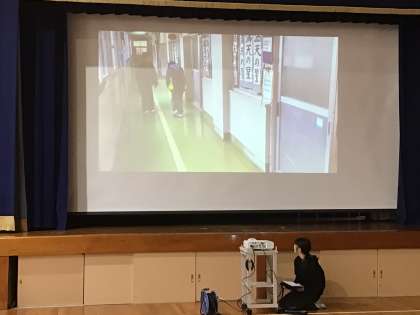 廊下の同じ側を歩いて衝突してしまうシーン、右側通行をして、さらにあいさつもするシーンを映像で見せてくれました。よくわかりました。