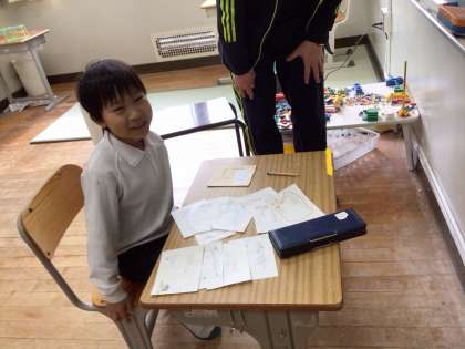 6年生の子たちとのふれあいを職員室前の写真を見に来たり、担任の先生と会話をしたりして、思い出しながら、メッセージを書きました。
