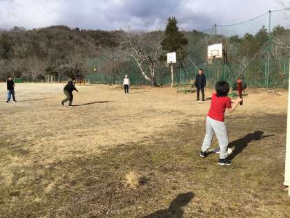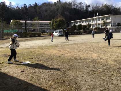ゆり組・ふじ組の2人がベースボールをしているところに、6年生の子たちがやってきて加わりました。最初はピッチャーの勢いのあるボールに翻弄されていましたが、だんだん打てるようになって得点が入っていきました。みんなで楽しく過ごせました。