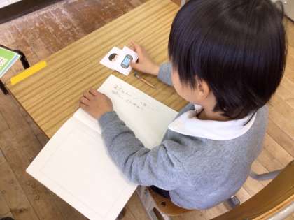 カードを2枚取って、文章を作りました。「弟がゲームであそぶ」