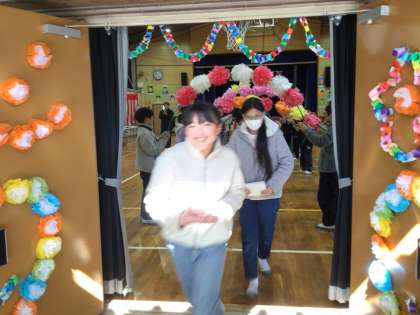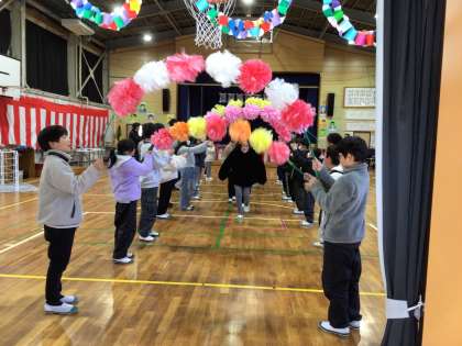 アーチをつくり、その中を6年生が通っていきます。 嬉しそうですね。