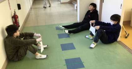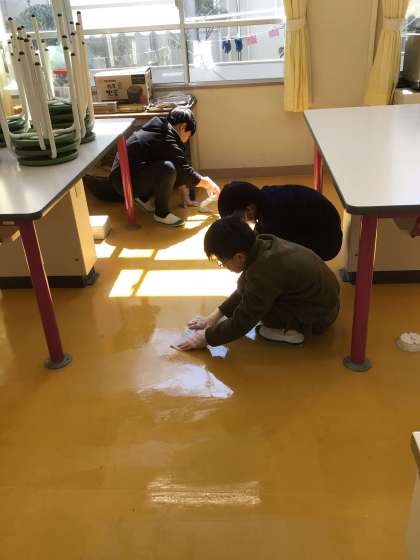 床は拭くと汚れがあります。 一生懸命磨きました。 「疲れた。乾くまで一休み」