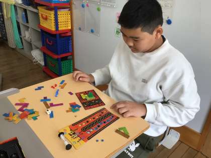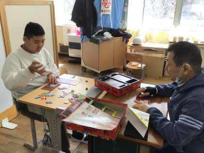 お題を引いて、よ〜いドンで、パズルを取って並べます。
