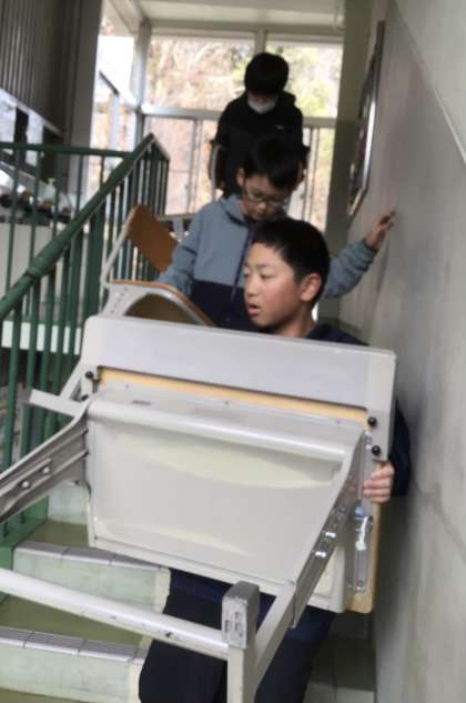 5年生は力持ちです。6年生教室の机を1年生教室に運んだり、余剰の机は指定の場所に運んだりしています。