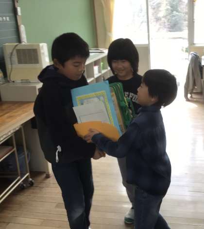 2年生の子がたくさんの荷物を運んできたのを見て、3年生が助けています。