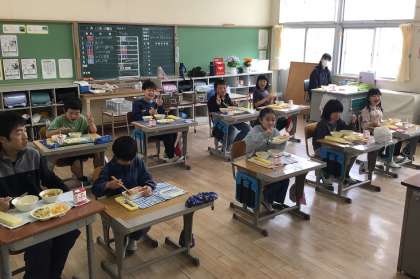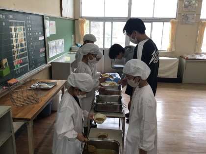 お昼ご飯の時間です。給食当番の人が、配膳する量に差がつかないように慎重に準備してくれています。こうして毎日食事ができることに、感謝の気持ちを新たにしました。