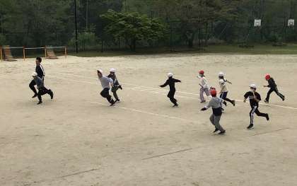上:元気にバトンパスの練習 何度も全力で走っています。もう少し気温が高くなったらマスクを外したほうがいいですね
