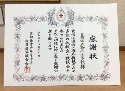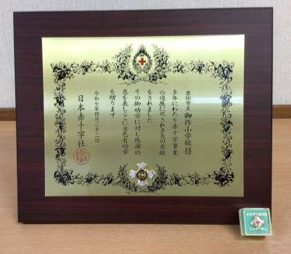 昨日、日本赤十字社より、御作小学校で取り組んできた義援金等への協力が20年となったことをうけて表彰を受けました。これまでの皆様のご協力に感謝申し上げます。賞状と盾は校長室に飾ってあります。