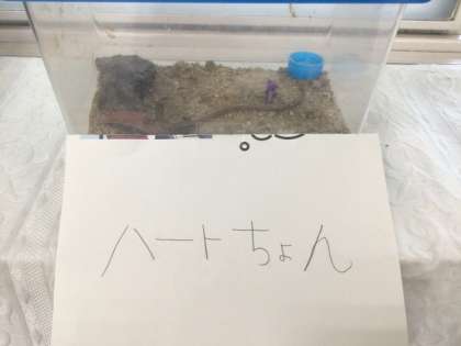 1年生の子たちがビオトープの周りで探し物をしている様子。「何を探してるの?」と聞くと、「ペットのカナヘビのえさだよ」「ハートちゃんっていう名前を付けたんだよ」と教えてくれました。教室に見に行くと虫かごに入ったカナヘビを発見。一生懸命に書いた名前が『ハートちょん』になっているところが、1年生らしくて、とても愛らしく思えました。
