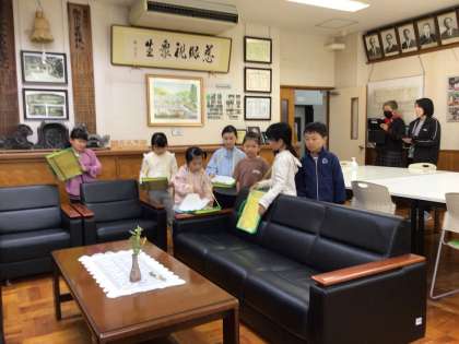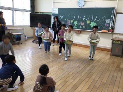 2年生が1年生を学校探検に連れて行きました。校長室にも来てくれました。ドアをノックしてから「しつれいします」と言って入るんだよ とお手本を見せてくれました。学校のいろいろな場所に宝探しのヒントが隠されているので、宝探しを楽しみながら学んでいました。