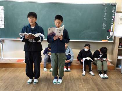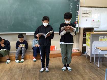 6年生の児童が国語の単元にある朗読を行いました。始める前に各々が「感情をこめて読む」「内容にあった声の強弱に気を付ける」などといった目標をもって取り組みました。さすが6年生。文字も絵もない状態で物語を聞きましたが、登場人物の表情まで浮かんでくるような朗読でした。