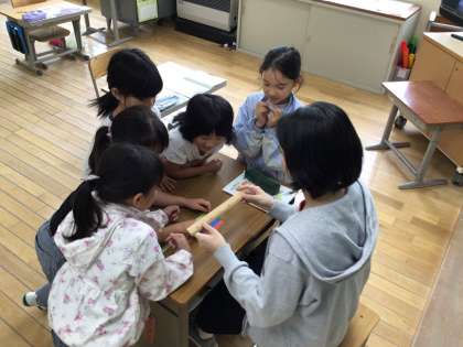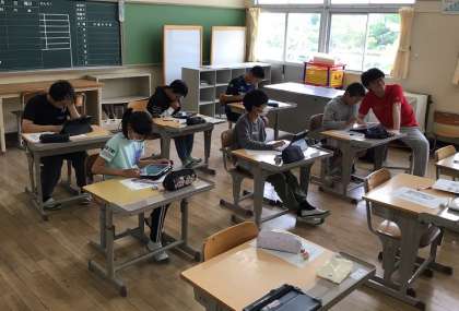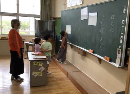 1年生は(わ)と(は)の使い分けの勉強です。「○○は◇◇です」という作文をして発表していました。2年生は「長さ」の勉強です。ものさしを使って長さを測ったり、10cmはどれくらいか予想して紙テープを切ってみるなど、実際に物に触れて学びを深めていました。6年生はタブレットを使ってクイズ形式の問題に取り組んでいました。