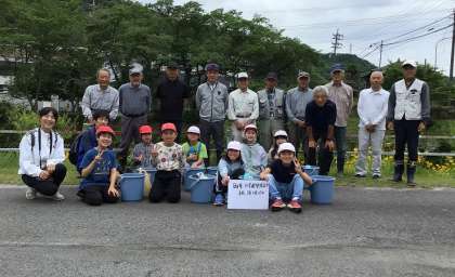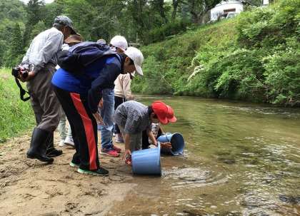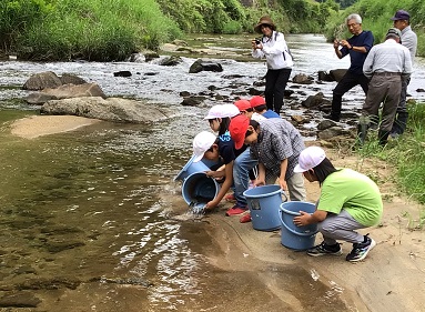 矢作川漁協の協力を得て、鮎の稚魚の放流を行いました。事前に放流場所の草刈り等の準備を進めていただいた地区の方のおかげで、安全に活動をすることができました。