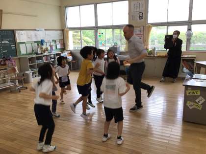 ブライアン先生と外国語の授業中。リズムに合わせて英語を言いながらジェスチャーをしています。動きが速すぎて写真がブレてしまいました。
