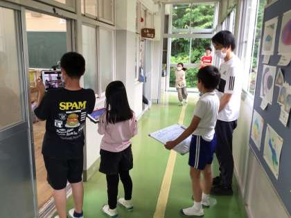 高学年は「学校での過ごし方」のビデオ撮影中。今は「悪い見本」としてチャイムが鳴ってから慌てて教室に戻っている様子。廊下にいるのはナレーションや撮影の担当です。