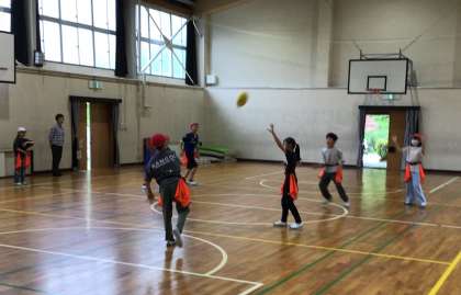 今日は雨で気温が上がらなかったため水泳学習は中止になりました。5・6年生は体育館でタグラグビーの試合で体を動かしました。