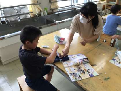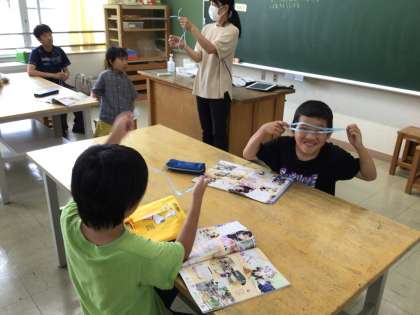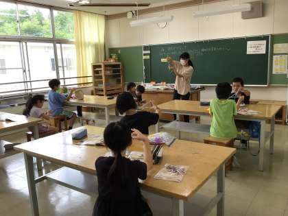 3・4年生は「ひも」の結び方やひもを使って教室を飾ってみるという授業中。2本のひもを1本につなげたり、リボン結びの練習をしたりしています。教室の飾り付けでは、子どもたちの自由は発想が見られ、楽しくなりました。