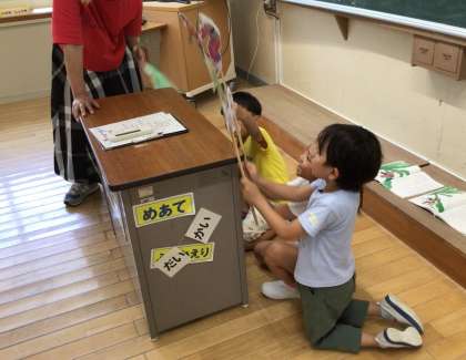 1年生が『おおきなかぶ』の劇練習をしています。校長室にも聞こえてくる元気な声で練習をしていたので、思わず見に行ってしまいました。かぶを引っ張る人(+動物)が増えるにしたがって、みんなの声も大きくなっていきます。さて、かぶは抜けたかな?