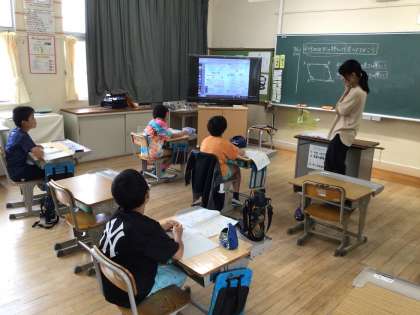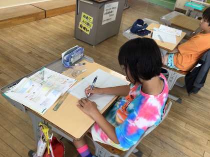 3・4年生の算数で図形の学習をしています。これまでに習った知識を活用して、三角定規とコンパスで平行四辺形を書く問題にチャレンジしています。うまく書けるかな?