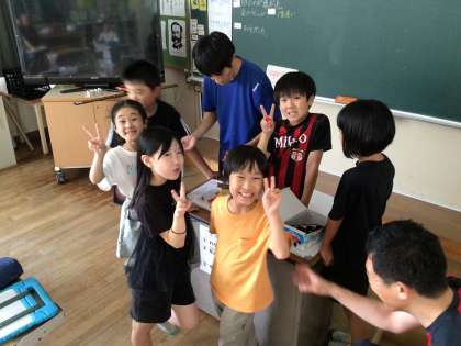 理科の実験中。電池の直列つなぎと並列つなぎで電球の明るさがどれだけ変わるかの確認中。直列つなぎにするとパッと明るさが増したことを確認して「すごーい」と声が出ました。2枚目は写真を撮っていることが見つかった瞬間。いつの時代も、同じようなポーズをしますね(笑)