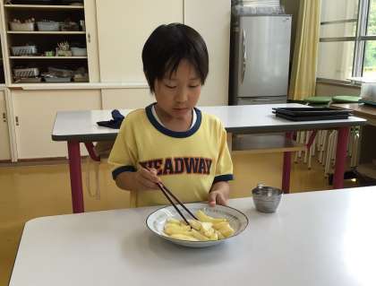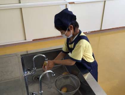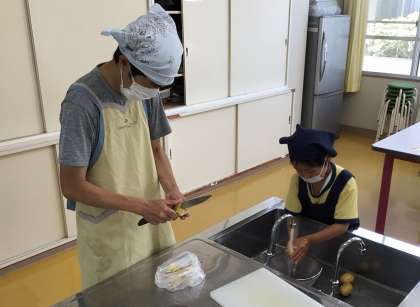 学校の畑で育てたジャガイモを使って調理実習をしました。きれいに洗って、皮をむき、カットした後で水にさらし、オーブンへ。とてもきれいに調理できました。職員室にもおすそ分けに来てくれました。とてもおいしかったです。ありがとう。