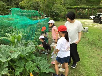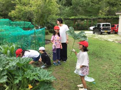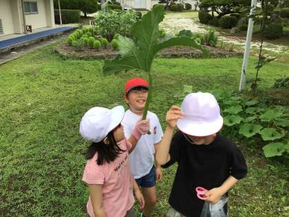 2年生が学年の畑で収穫とお手入れの作業中。大きくなりすぎたズッキーニの葉っぱを切ってトトロごっこ。