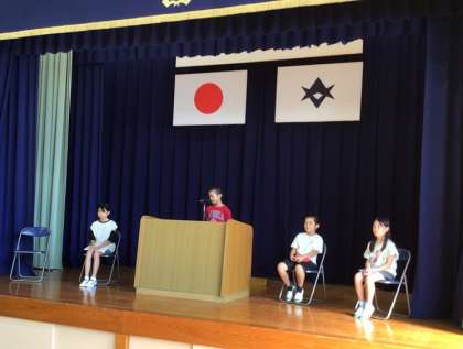 夏休み後集会で4名の児童が意見発表をしました。どの児童も、自信をもって大きな声で発表してくれました。