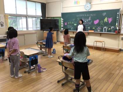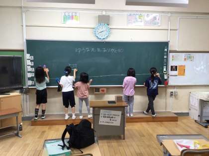 ありがとうございました & よろしくお願いします 公開日 2025/09/24 更新日 2025/09/24 お知らせ 2年生担任の籔下先生が産休に入る前の最後の勤務日、朝の会の前に子どもたちが黒板にメッセージを書いていました。心のこもった温かいメッセージや楽しそうな絵でいっぱいになりました。 今日から新しい担任として尾崎先生に復帰していただきました。よく知っている先生なので、子どもたちも安心しているようでした。これからもっと仲良くなって、楽しい学級にしていきましょう。