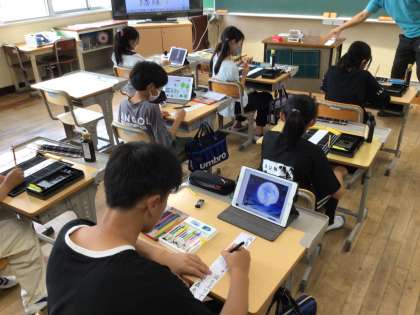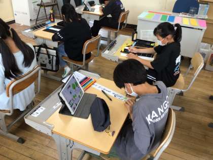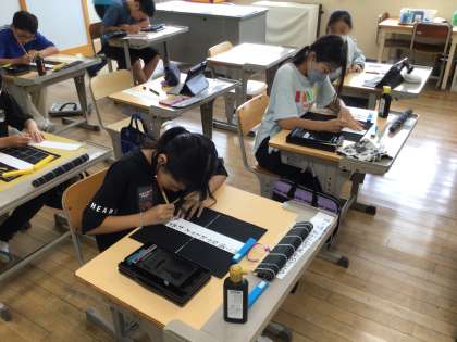 修学旅行の思い出を俳句にして筆書しています。金閣寺・京都タワー・奈良の鹿など、バラエティ豊かな題材で楽しそうです。