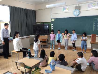 2年生が国語の授業で学んだビーバーのことを3・4年生にクイズ形式で発表しました。絵も描いて分かりやすく伝える工夫がしてありました。参加した3・4年生からは、自分も2年生の時に勉強したけど、忘れてしまっていることもあったので、思い出せてうれしかったなどの感想が伝えられました。