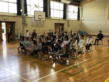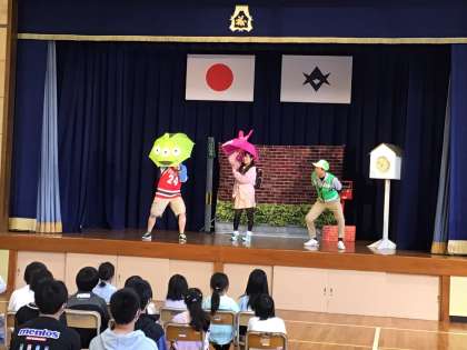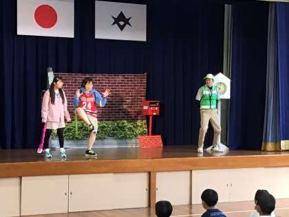 2、3時間目に交通安全集会を行いました。先日募集した交通安全啓発標語の優秀作品の表彰に続き、劇団『笑劇波』による交通安全啓発劇を観劇しました。