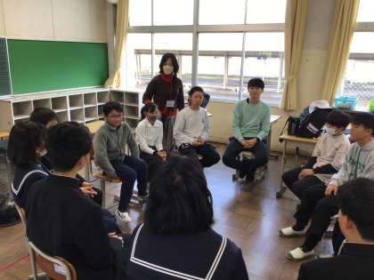 生徒会役員と一年生の学級委員が交流に参加してくれました。小学生から中学校生活に関する質問をして、いろいろと教えてもらっていました。