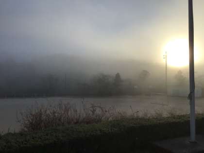 今朝の学校の様子です。霧に包まれて幻想的です。