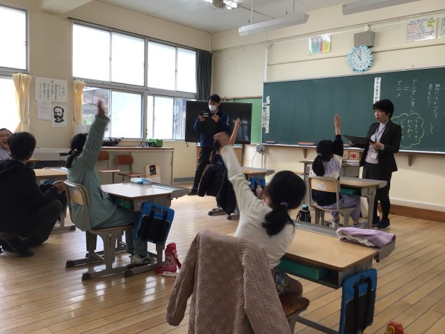 1年生は体を使って数字を表現しています。これは『6』かな?