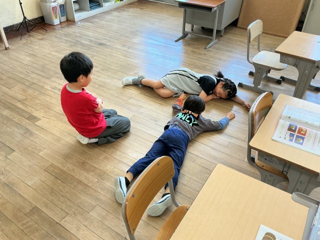 2年生は音楽に合わせて自由ダンスの時間。元気に教室を飛び回っていました。足音が1階の校長室まで響いてきたほどでした。かと思えば、静かな音楽になった途端、お昼寝の時間のように床にころがりました。事前の打ち合わせもしていないのに、タイミングがぴったりで驚きました。