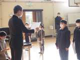 今日の朝は表彰式を行いました。初めに読書感想画の入賞者の表彰を行いました。