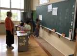 教科書をもって正しい姿勢です。音読の声もよく出ていました。高学年は書写の授業。...