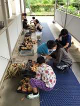 収穫した玉ねぎを乾燥させたものの葉を切っています。全部で150個くらいの大きな...