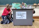 2時間続きの授業の2時間目。子どもたちがひもを使って自由に教室を装飾しました。
