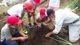 1年生が学校の畑に新しくサニーレタスを植えました。畝にマルチシートをかけ固定し...