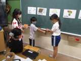 1・2年生と6年生が朝のEタイムで英語の活動をしました。英単語カードを並べ、左...