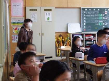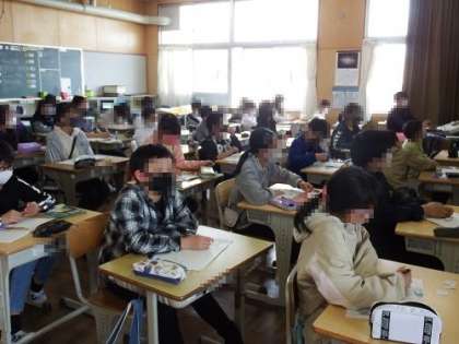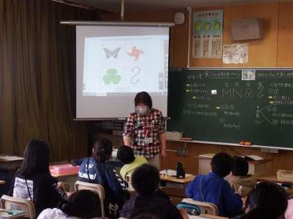 6年生は、算数で「対称の図形」の学習を進めています。線対称や点対称の特徴を、デジタル教科書を使って視覚的に確認したり、共通点や違う所を話し合ったりしながら学んでいます。