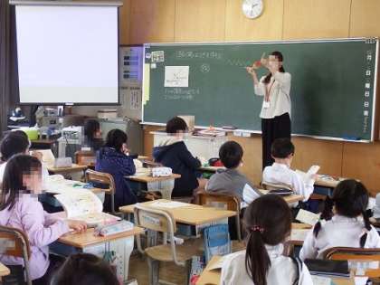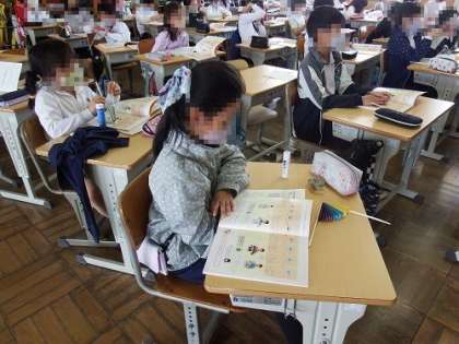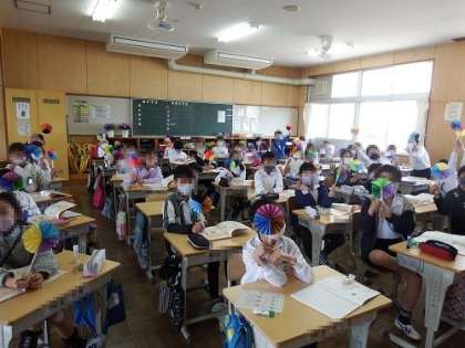 4年生の算数は、「角とその大きさ」の学習です。実際に、自分で扇の形を、紙と割りばしで作成し、角の大きさについて学習を進めました。体験を通して学ぶのは、とても大切です。