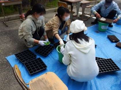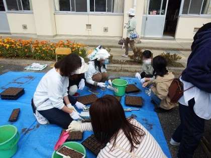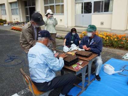 地域の皆様とプチボラみやま隊のボランティアの皆様にお越しいただき、フラワーボランティアとして、花の種を植えていただきました。17名の方の参加していただいたこと、心より感謝いたします。小さな種がすくすくと育ちきれいな花をつけることを願っています。子どもたちにもお昼の放送で紹介させていただきました。現在職員室前のテラスで育てています。早く芽がでるといいです。