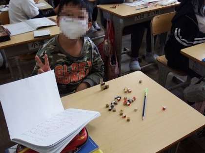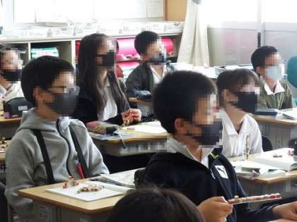 5年生の算数。立体の体積を考えます。実際に1㎤の立方体を使いながら、学習を進めました。「16㎤の立体をつくってみよう」という課題から、様々な立体が考え出され、友達の考えた立体をプロジェクターを使って紹介した時は、感嘆の声がたくさん上がりました。子どもたちの思考はやわらかいです。