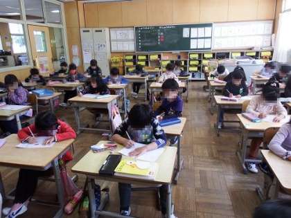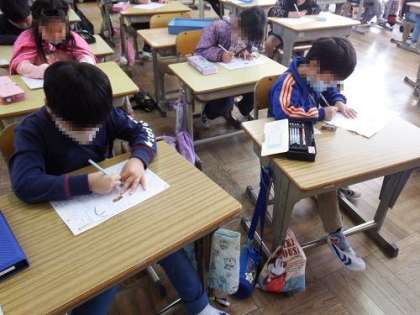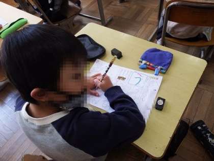 1年生の学習は、基本である「ひらがな」から進めています。今日は、「う」の書き方を学習しました。手本を見ながら、丁寧に書き進めます。注意することを頭に浮かべながら、集中して書いています。