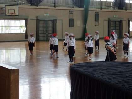 1年生では、体育の時間に、集合・整列の仕方や基礎的な運動などの学習に取り組んでいます。みんなで円をつくったり、動きながら回ったり、座ったり・・・。子どもたちにとって、様々な動きの変化がとても楽しそうでした。