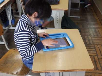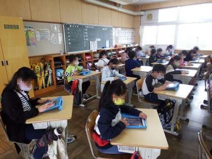 本年度もタブレットを使った学習が始まっています。先生の指示を聞くと、真っ先にタブレットを操作する子どもたち。子どもたちは、タブレット操作に慣れるのも早いです。算数の問題に楽しみながら取り組んでいる子どもたちもいました。写真は、4年1組、2組、3組の様子です。