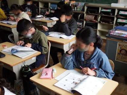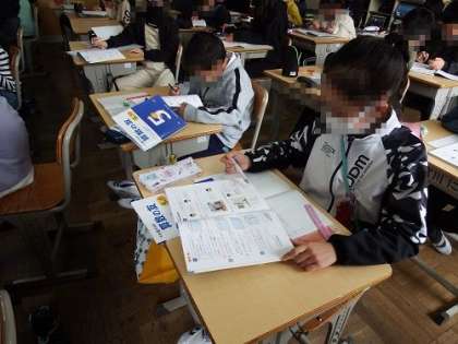 5年生の算数の授業の様子です。ペットボトルの中の1リットルの水は、1000㎤のマスにきちんと入るのか。見た目ではとても入るようには見えないが、実際実験を行うと見事に水が入ります。子どもたちは不思議そうに、でも、納得顔でした。