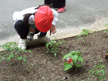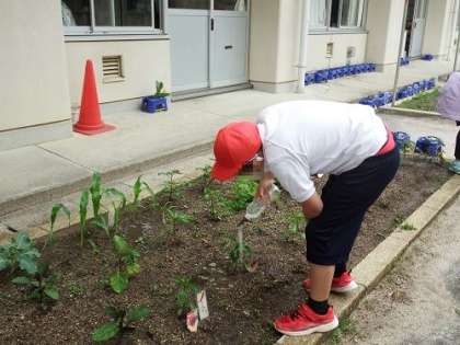 7・8・9・10・11組の畑で野菜の栽培が進んでいます。なすやミニトマト、とうもろこし、唐辛子などいろんな野菜の栽培に挑戦しています。今から収穫するのが楽しみです。水やりや草取りをしっかり行って、大切に育てたいです。